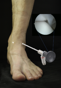Arthroscopy, or otherwise known as “keyhole” surgery, is a specialised procedure performed using a small camera and designated instruments that are inserted into the ankle joint through small “holes” (of 5 mm). This minimally invasive technique has evolved in the last few years and currently most of the surgeries that had classically required of long skin cuts and incisions to expose the whole ankle joint can be performed with tiny cuts. The benefits are many and include a faster recovery, day case instead of inpatient surgery, fewer complications, and almost invisible scars.