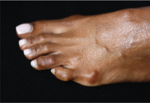 The protective cartilage lining covering the end of your joint suffers wear and tear, causing pain, swelling and stiffness. Possible causes of osteoarthritis include joint injury, overuse, genetics or ageing. Any joint in the body and in the foot can be affected by osteoarthritis. When the big toe joint suffers osteoarthritis it is also termed hallux rigidus as it commonly causes a stiff or rigid toe that causes difficulties when walking. At times, a gout attack can resemble some features of hallux rigidus although the treatment will differ significantly.